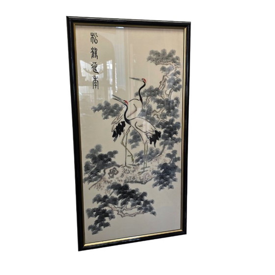 This elegant Chinese silk painting of cranes, created in the 1980s and 1990s, depicts a traditional depiction of cranes in a natural landscape. The work is painted on silk, a technique used in Chinese painting for centuries.
