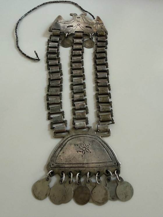 "Trapelacucha" of the Mapuche Indians from southern Chile. The necklace is antique and dates from 1920-1940, handmade by this Indian tribe from alpaca silver, a silver-colored alloy of copper, zinc, and nickel. Weight: 205 grams.