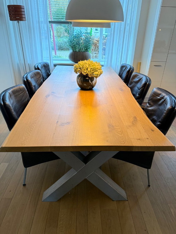 Imagine a cozy evening with friends or family at this beautiful tree trunk dining table. With its generous 240 cm length, this table offers plenty of room for everyone. The robust wooden top exudes natural charm, while the sturdy metal legs provide a modern twist.