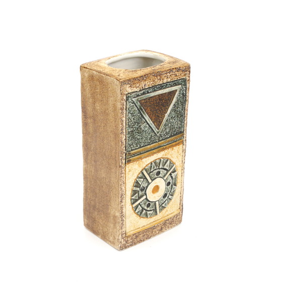 This beautiful vase, called "Brick Vase," has a rectangular shape with an oval opening at the top.