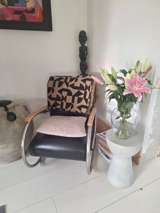 Tubax Vilvoure chairs upholstered in black faux leather, in excellent condition except that the springs on one chair are pressing against the upholstery; not broken, very comfortable.