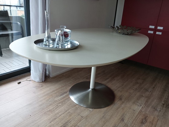 The Tulip dining table is an elegant and timeless piece that fits perfectly into a modern interior. With its iconic round shape and sleek metal base, this table offers a stylish and functional addition to your dining room. The white tabletop contrasts beautifully with the silver base, creating a refined look. Ideal for cozy dinners or as a focal point in your living space.