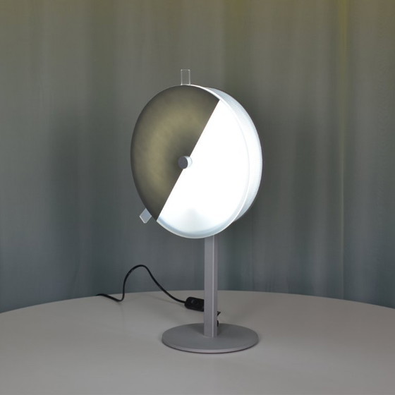 The Turning Disk table lamp is a unique addition to any interior. With its striking 90s design, this lamp immediately catches the eye. The combination of silver and grey creates a modern look that fits perfectly in a contemporary setting. The lamp is made of metal and plastic. The original wiring is intact, suitable for EU use without grounding. Add a touch of retro flair to your space with this special table lamp.