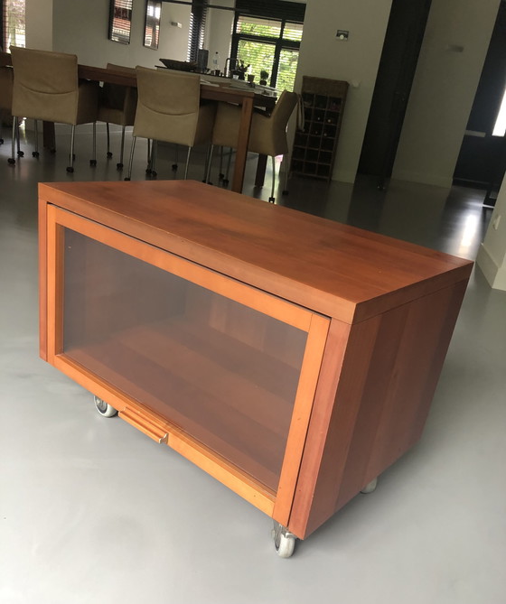 Wood Veneer TV or Music Cabinet on Wheels of Italian Design. The front is made of glass and can open.