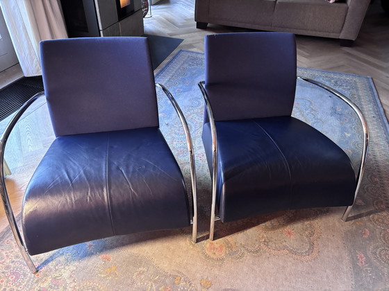 Introducing a pair of elegant Montis Lomas chairs, perfect for adding a touch of modern sophistication to your living space. These chairs feature a sleek blue leather finish complemented by sturdy metal arms and legs, offering both style and durability.