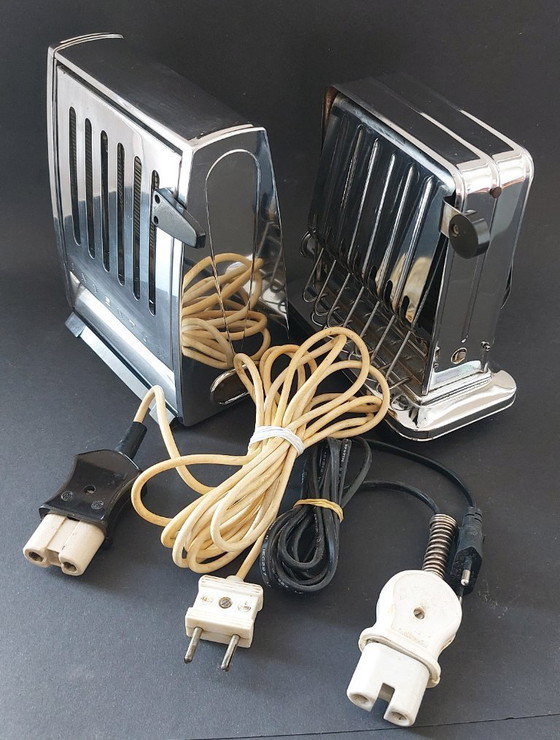 Two Inventum vintage chrome toasters, likely from the 1950s or 1960s, featuring bakelite handles and a hinged side-loading design.
