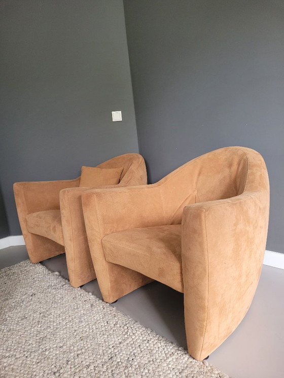 These Leolux armchairs (model Carabas) have salmon-colored Alcantara upholstery. The ottoman and cushions are also upholstered.