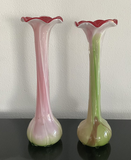 The two tall Murano-style vases are multicolored. One vase is 40 cm high and the other is 39 cm high.
