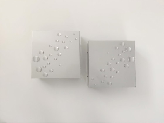 Two impressive wall lamps by Raak. The type is C1627. The lamp is called Zonneregen (Rain of Stars) because the light shines through the various openings. The lamps are marked; this is the large version. The small version is type C1624. The suspension for the lamps is still present. Plugs and bulbs are not included. The lamps have a few light stains, but are in good condition overall.