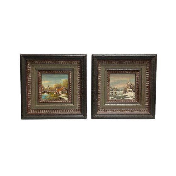 Two small oil paintings on mahogany panel, signed v. Ast., dating from the second half of the 20th century. A pair of small paintings depicting landscapes in spring and winter, both signed v. Ast. The artist is unknown. They are oil paintings on mahogany panels and framed.