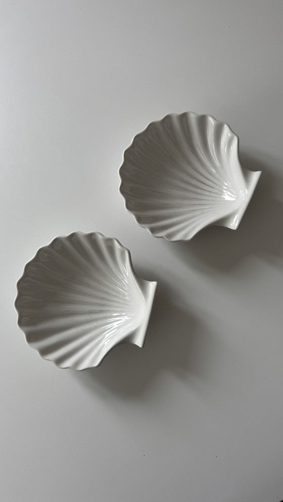 Elegant set of two ceramic shell-shaped dishes, made in Japan and marked "Oven Proof Japan." These mid-century pieces were originally used for scallops or gratins in the 1960s, but are equally beautiful as decorative pieces today.