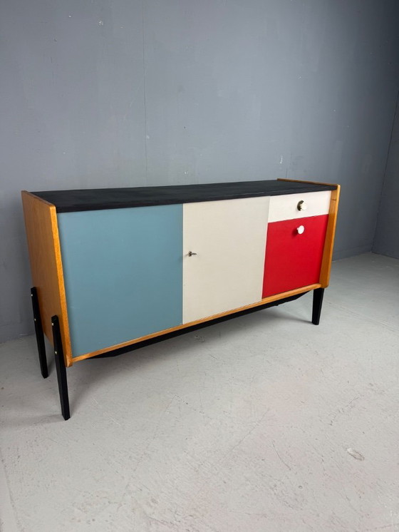 Beautifully colored sideboard from the 1950s and 1960s. The original colors of the doors and drawer fronts have been clear-coated to preserve them. The top is painted black. It may have been made by UMS Pastoe, but it is not marked.