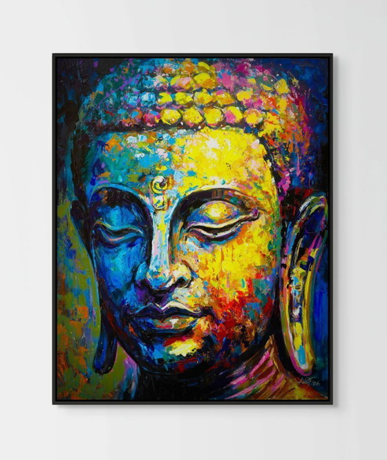 This special artwork brings peace, balance, and a serene atmosphere to an interior. The painting depicts a calm Buddha with a meditative aura and subtle golden accents that give the work a warm and spiritual appearance.
