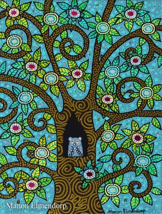The painting is meticulously detailed and constructed using hundreds of hand-applied dots, resulting in a beautiful and original result. This is a highly labor-intensive painting technique; many hours of work and love went into this painting.