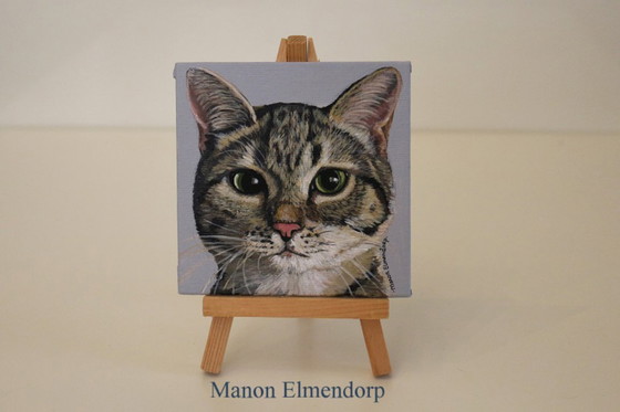 The painting is painted with great detail and realism; the kitten's eyes look lifelike.