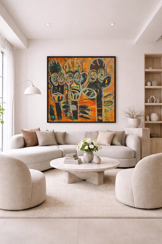 This painting possesses exactly what collectors seek: a strong visual impact, immediate recognizability, and an authentic energy that gives character to any space. The 100 x 100 cm size makes it ideal as a statement piece: powerful enough to dominate an interior, refined enough to shine in a collection. Aboudia’s work is appreciated worldwide for its unique combination of urban spontaneity, African imagery, and international contemporary relevance. Moreover, a work from 2018 represents a very interesting period in his artistic development.