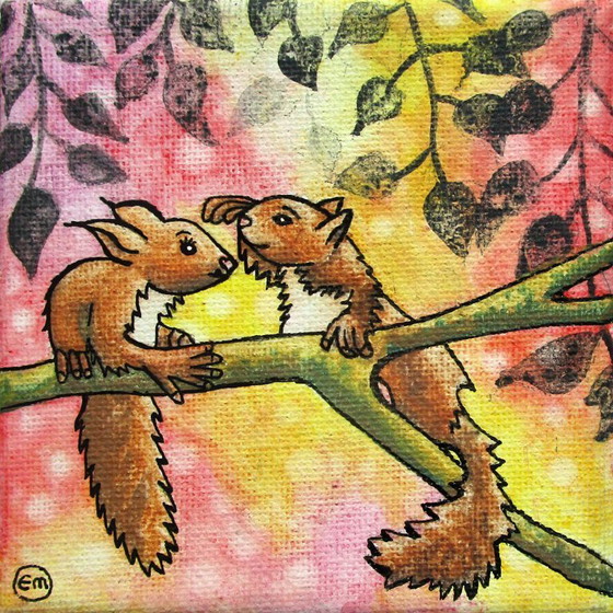 Super cute painting of adorable squirrels on a branch. Hand-painted, a true work of art, but very small!