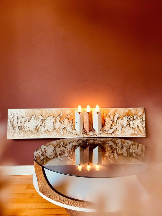 What an amazing and original item this is! A headboard covered with paint to resemble a stone motif, finished with amazing lighting. What an eye-catcher and very unique!