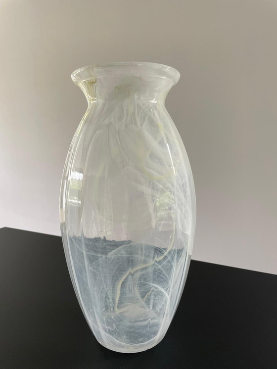 This unique semi-transparent vase with subtle facets is a beautiful addition to any interior. With a height of 30 cm and a modern design, it exudes elegance and sophistication. The vase is made of glass and features subtle white and pale yellow marbling.