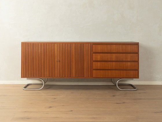 Unique sideboard from the 1950s by the Oldenburg furniture workshops. Corpus in teak veneer with four drawers, two ribbed doors, a shelf, and new stainless steel feet in Bauhaus design. The top surface was coated with black Formica.