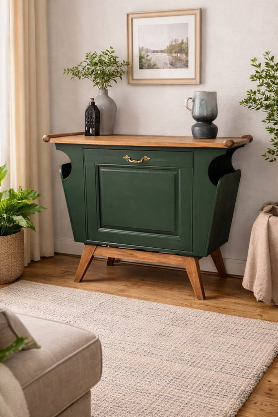 Beautiful, unique vintage cabinet that has been completely restyled in a deep dark green color with a warm wooden top. A real eye-catcher that fits perfectly in a country, modern, or Scandinavian interior.