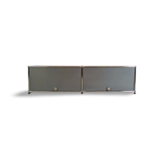 We are offering a beautiful USM Haller sideboard (size 1x2) with two upward-opening doors for sale. The components have been professionally cleaned and the sideboard has been completely rebuilt.