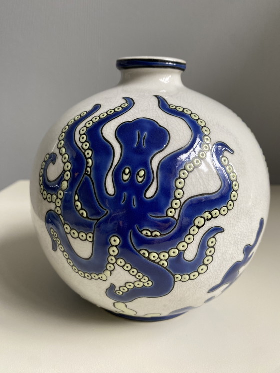 This exquisite Belgian porcelain vase by Keralouve is a testament to refined craftsmanship and artistic elegance. Adorned with a striking blue octopus motif, it captures the essence of Art Deco design, making it a captivating centerpiece for any sophisticated interior.