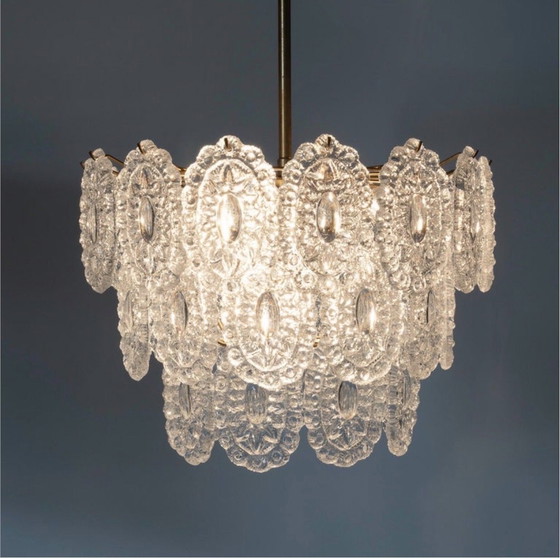 Illuminate your space with the timeless elegance of the Val Saint Lambert retro chandelier. This exquisite piece, crafted from high-quality glass and metal, exudes a sophisticated charm that is sure to captivate. The chandelier's intricate design and transparent glass elements create a dazzling display of light, making it a perfect centerpiece for any room.