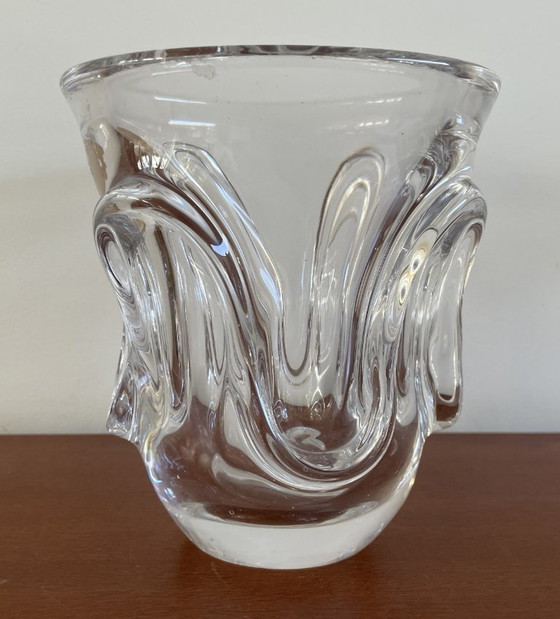 This beautiful vintage crystal vase from Val Saint Lambert, designed by Antonio & Guido Bon, is a stunning example of craftsmanship and elegance. With its flowing lines and clear crystalline texture, it adds a touch of timeless beauty to any interior.