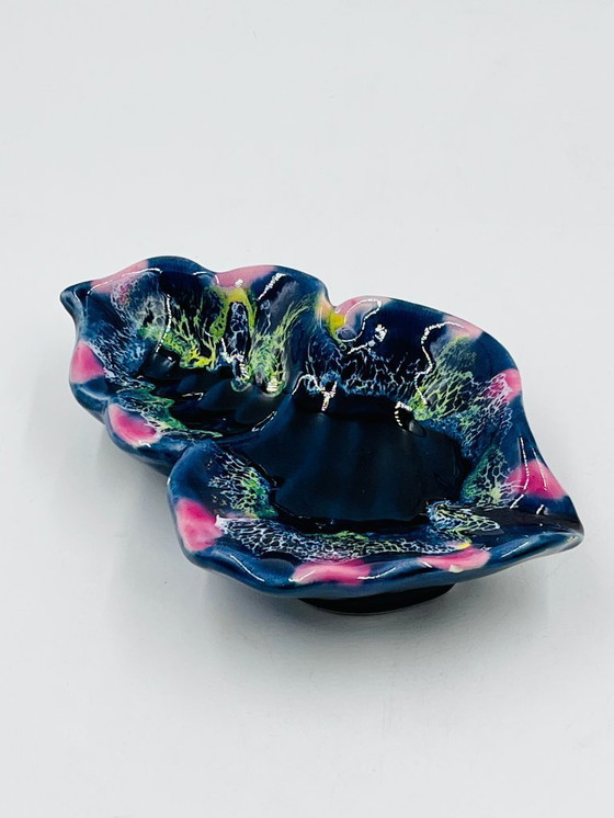 A Vallauris ceramic trinket dish from the 1960s-70s, with a free-form shape reminiscent of a stylized seashell. Its organic silhouette with undulating edges is inspired by the mineral and marine world, typical of the biomorphic modernist design of the French Riviera. Superb polychrome glaze with volcanic effects blends deep blue, intense black, luminous green, and touches of magenta pink, with vibrant textures and nuances. The glossy interior features expressive reliefs, giving depth and movement to the piece.