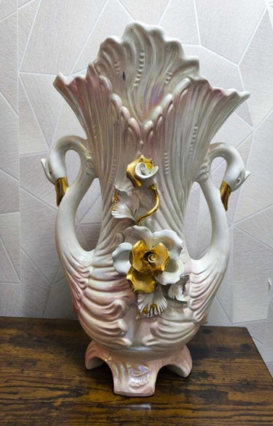 This beautiful vintage vase exudes elegance and refinement, perfect for a classic interior. With its graceful swan motif and delicate gold accents, this vase adds a touch of luxury to any space. The soft pink and white tones create a subtle and charming look.