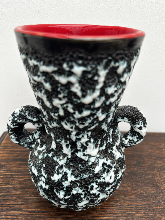 This striking Fat Lava vase, attributed to Vallauris, features a bold red interior contrasted by a textured black and white exterior. Standing at 21 cm tall, its unique 'ears' design adds a touch of vintage charm to any space. Perfect for collectors or as a standout decorative piece.