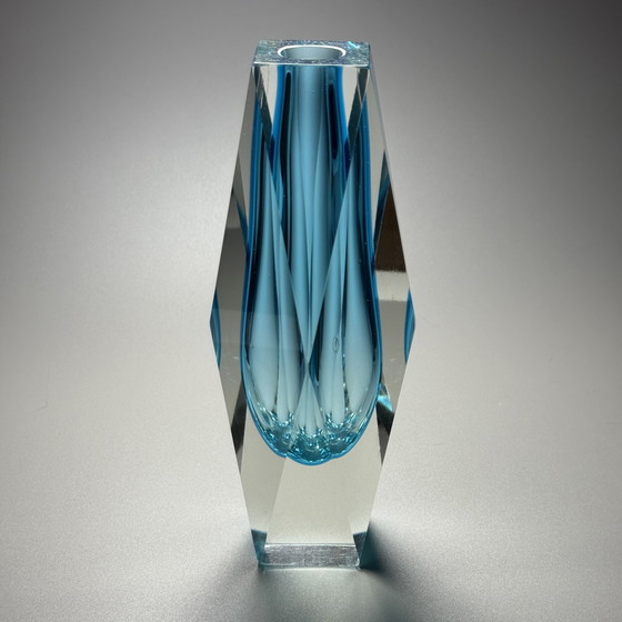 This striking Murano glass vase was designed by Flavio Poli around 1960, during one of the most innovative periods in post-war Italian glassmaking. Executed in thick, sculptural crystal with an intense aquamarine core, the vase is characterized by sharply faceted sides that frame a fluid, organic inner form. The contrast between precise geometry and soft internal contours creates a dramatic play of light, depth, and refraction—hallmarks of Poli’s mature style.