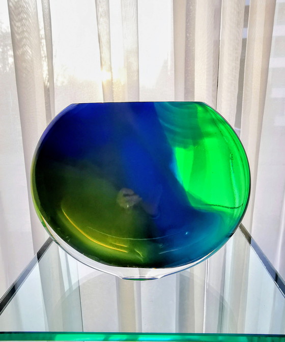 This beautiful Hoglund vase from the 1980s is a real eye-catcher for your interior. With its unique elliptical shape and dazzling color combination of blue and green, this vase brings a touch of artistry to any room.