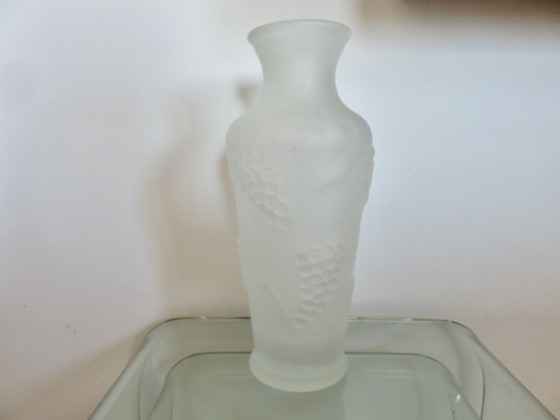 Large frosted glass vase, made in Italy, decorated with bunches of grapes and apples. 1960s. Height 32cm. Diameter at widest point 14cm. Very good condition. Made in Italy engraved on the bottom.