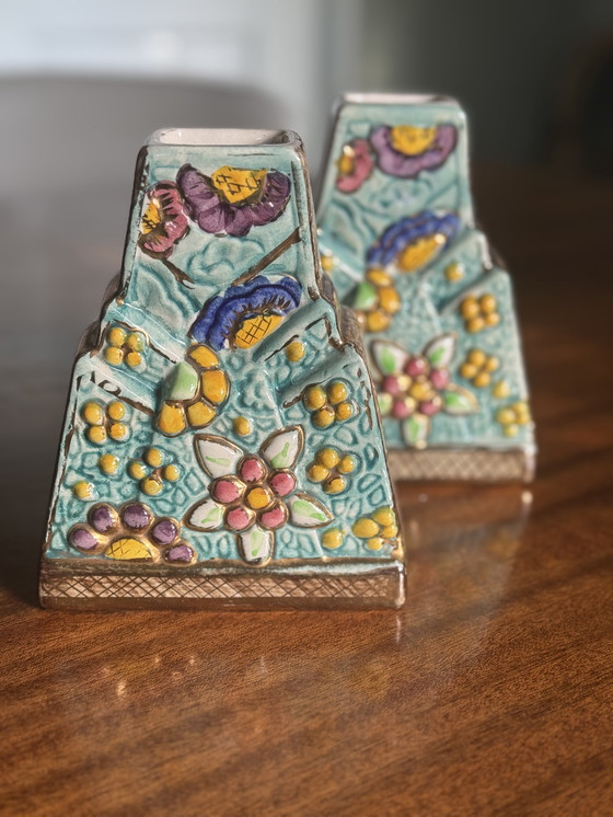 Immerse yourself in the timeless elegance of these Huber Bequet vases, where Art Deco sophistication meets vibrant artistry. Each vase is a masterpiece of ceramic, decorated with hand-painted floral motifs in a stunning array of blue, yellow, pink and purple hues against a rich brown background. The unique triangular shape adds a striking accent, making these vases a striking addition to any interior. Perfect for putting fresh flowers in or as stand-alone decorative pieces, they bring a burst of color and style to your living space. Beautify your home with these stunning vases and let their timeless beauty enchant your senses. Rare and decorative, "Nice Time". Consisting of two vases. Produced in Hubert Bequet's famous workshop in Quaregnon, Belgium, active from 1934 to 1963.