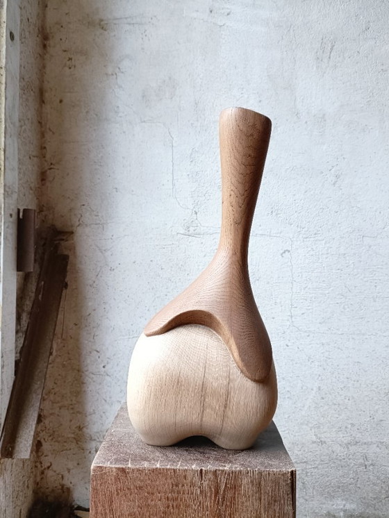 Vase/sculpture in solid carved oak for dried bouquets. Signed. H36 x D15 cm Follow the workshop's creations on Instagram: retrodom_broc