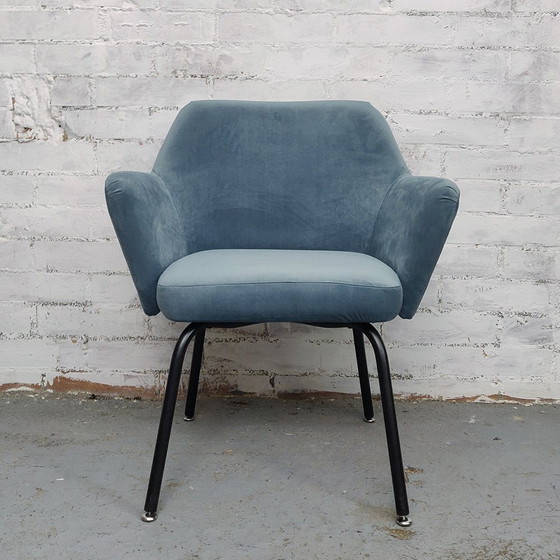 Armchair vintage 60s, again with upholstered velvet blue-gray color. The structure of the legs has been painted black.