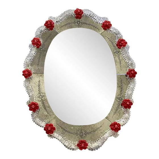 Spectacular oval mirror with Murano glass transparent elements and red flowers.