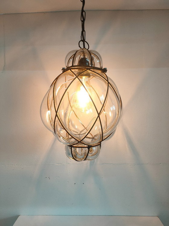 Beautiful Venetian-style pendant lamp with convex glass in a metal frame. Due to the curvature in the glass and the frame, the lamp casts a beautiful, playful light. Naturally, this depends on the light source used. This is a vintage item with light signs of use, scratches, and blemishes. Overall, this piece is in very neat condition, without breaks or clearly visible damage.