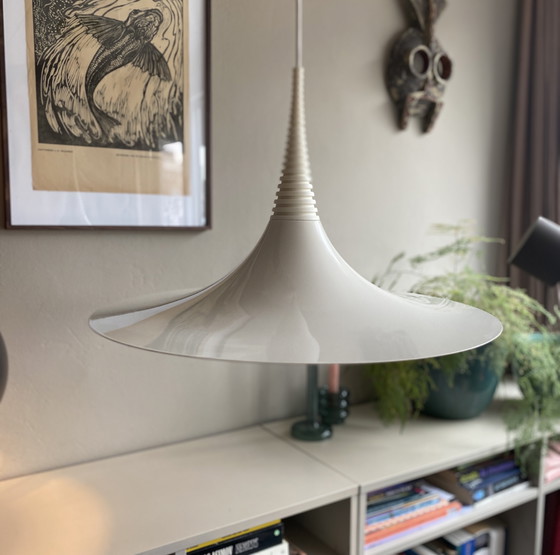 This Verona pendant lamp with a witch's hat was designed in the mid-1980s by Ad van Berlo and was called Xantippe. It was produced by Vrieland Design in the Netherlands (Vrieland United Factories B.V., Goes, the Netherlands). The lamp received an iF Design Award in 1987. This pendant lamp is labeled: Verona pendant, Knud Christensen Elektric A/S.