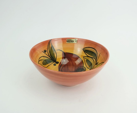Very decorative mid-century ceramic bowl with hand-painted motif typical of the time. Decor name 'Inga'. 1950s to 60s.