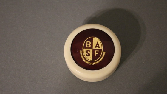Discover a rare collector's item: an old advertising tape measure from the renowned company BASF, specifically designed for polystyrene. This vintage piece impresses with its cream-colored plastic body and distinctive brown logo, reflecting the charm of bygone eras. With a diameter of 5.5 cm and a tape length of 2 meters, it is not only a practical tool but also a decorative highlight for collectors and enthusiasts of vintage advertising merchandise.