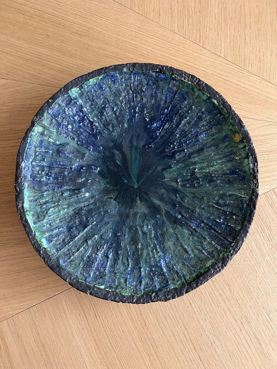 Beautiful round, decorative ceramic bowl with a textured surface and an iridescent blue-green glaze, made using a raku firing process. The rims have a robust appearance, and it is quite heavy.