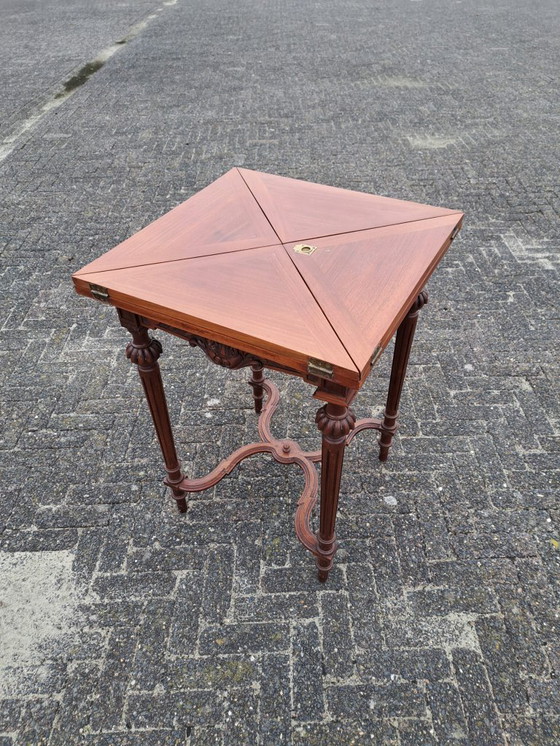 Victorian envelope card table in good condition. The table folds open for card games. The top plate is easily removed, allowing you to place another wooden platform or game board.
