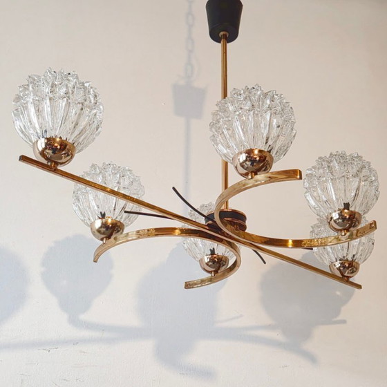 Good overall condition. Slight oxidation of the brass. A few glass globe tips are chipped; it doesn't affect the light at all (neither on nor off), but I'm mentioning it anyway: see photos. Works. Height 51 cm. Length 82 cm. Width 46 cm. Magnificent vintage chandelier. International bidders welcome! Please feel free to contact us with any questions you may have. Thank you.