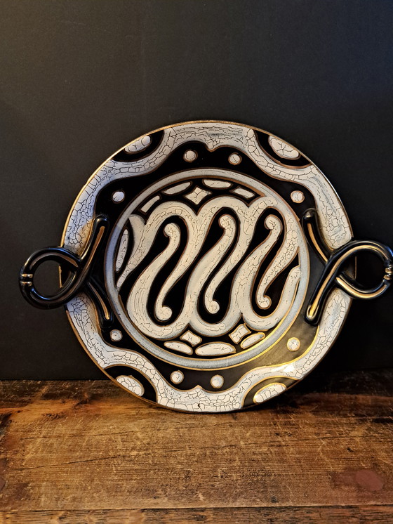 Vintage 1950's Ceramic Bowl with Handles south Dutch Gouda Hand Painted Black with Gold