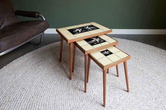 It is very special that this set is still complete: 3 small side tables as a nesting set, featuring very unique tiles with a fish motif.