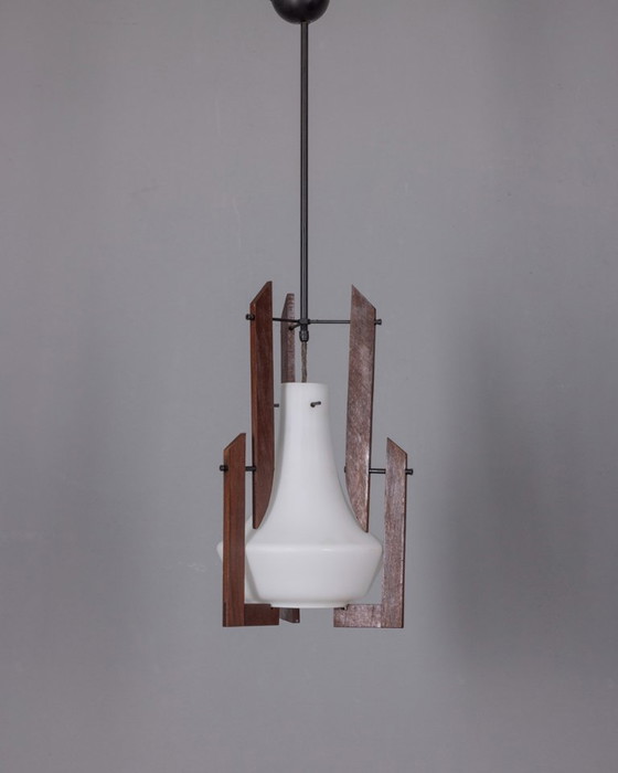 Chandelier with metal and teak wood structure and white opal glass lampshade, designed by Ico Parisi, 1960s.