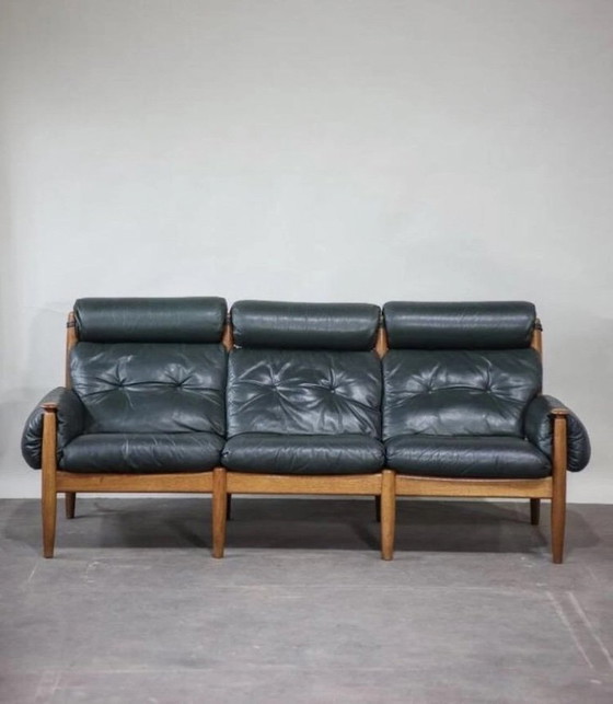Beautiful and comfortable vintage 3-seater leather sofa, designed in the 1960s by Swedish designer Eric Merthen for Ire Møbler. The frame is made of oak wood and the upholstery of stunning dark green leather. The design is reminiscent of the iconic works of Sergio Rodrigues. A true mid-century eye-catcher that’s also incredibly comfortable to relax in! In very good condition with only light signs of use consistent with its age.